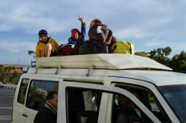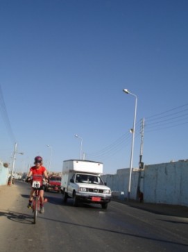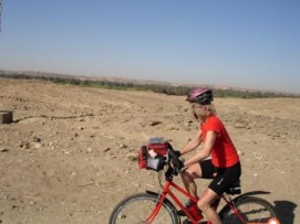 We did not sleep long the night before, first of all because we had a dinner on a Nile cruise boat. Jenny went belly dancing, she was almost forced into it by the entertainers. Secondly we needed to get ready with all the luggage and thirdly we were a bit nervous for the start. We were told that our luggage needed to be loaded on the bus at 07:00, but we are in Africa, so the buses were late, but with the help of almost everybody we got them loaded on time and left for the first 9 km's to the pyramids, where officials did a short speech, Jenny was interviewed by the press and off we went for 12.000km to Capetown. For the first part we where in hectic traffic, but after about a hour we came of the major highway and headed for the Red Sea. Police is all around us, in cars, on motorcycles and on the side of the road. They love to show off sounding their sirens. We had expected to do 130km's that day, but the police did not approve the campsite and we finally had to do 148, not something we liked, but we are in Africa you know. The campsite was alongside the road, between some unfinished buildings, one of which was inhabited by some dogs, who welcomed us. Nice, but unfortunately they decided to continue with that until we left the next morning. There were no toilet and washing facilities, so we cleaned ourselves with wetties and had our first camp dinner sitting next to the bus. Before that we had Randy announcing the winners of the day, Peter and Joan, and the tour for tomorrow. Because we cycled more today, we will only do 140 km tomorrow . Never believe a tour leader at first sight! Back to the top |