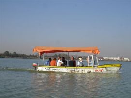 In the hotel we had a real breakfast in the morning and then went of to go to a Monastery on the other side of the lake. We were shuttled to the boats and had a one hour trip to a place where a very interesting Monastery is build. The buildings is like a church, round in shape with a outer and an inner circle and a middle part that is not accessible other then by the monks themselves. The walls of the inner circle are beautiful decorated with paintings explaining the bible as we know it. Unfortunately our photo camera was Out of Order during that visit, so we only have a video (for which we had to pay 100 Birr = 10euro), so be patient if you want to see the images! On our way back to Bahir Dar we visited two islands, or better, the women visited the island that was accessible for them and the men another one. The latter island is not allowed for women! On the "women island" Jenny saw women making shawls in the color of the flag of Ethiopia, yellow, green and red. The trip back over Lake Tana was long, as we also visited the point where the Bleu Nile starts to flow out of the Lake. It's funny to see that it flows in southern direction; you might expect it to go North towards Egypt, but the Bleu Nile makes a huge turn in Ethiopia towards the north after it exits the lake. Later in the afternoon we did some shopping and had a wonderful fruit cocktail on a terrace with two of the other cyclists. Back to the top |