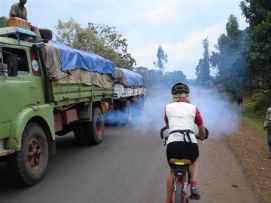 A lot of climbing today, 2100 meter in total. One of us had something to celebrate and invited everybody on a fruitjuice, very nice and a good initiative! Thanks Ron! Part of the landscape reminded us of Indonesia, plenty of banana trees and consequently a lot of green. We passed one of the Americans, who told us that his frame had broken. Needless to say that he was not a happy man to say the least. In the evening a discussion started as how he could continue the trip, get a new frame, use some else's bike, etc. etc. Perhaps that in Nairobi he will be able to find a solution and in the meantime use a bike of someone that does not want or cannot cycle. Back to the top |