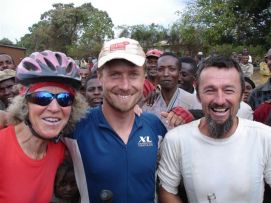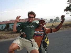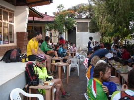 How a beautiful spot can be spoiled! Around 22:00 the evening before, the local yought came to the lake and started a party with music so load that nobody could sleep! Yes it is there country and yes it was Saturday night, but was it really needed to let us almost vibrate on the bases of the loudspeakers? Many of us asked them to turn the music down, but only at 4 o'clock they stopped the party. We needed to get up at 6:00, so as a revenge the crew from African Routes blew their horns loud and frequently at that time and the lunch truck started music that was almost as loud as they had done during the night. It does not solve anything of course, but the reaction can be understood. Today we have to clime about 1200m, that is get in shape for the day after, where we have to clime almost the double in meters. We saw a couple of monkeys on the road, wildlife is increasing! When we came trough a little village, we thought that some of our group where having a coke stop, plenty of people were gathering in front of a pub, but no, 2 "strangers" came to the roadside, 2 cyclist from France who are on their way around the world. We needed to take a picture of that naturally.