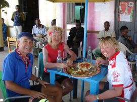 Yesterday evening we went to an Italian restaurant and were for 2 hours back in Europe in terms of food, environment, guests and yes also a bit the price we paid! But we loved it, it was exactly what we needed after 6 weeks of pedaling along the African roads and mostly sleeping in the tent and eating food that is best described as "basic". The morning of our rest day we spend in the usual way, getting up a bit later, doing Internet, cleaning the bikes and our clothes. We got a new saddle and new gear shifters with the help of our supplier Vittorio, our daughter and a Belgian cyclist who joined us here in Addis. The evening we went with a group to another Italian restaurant, called Top View. And that was exactly what it was, a beautiful view over Addis with the run going down and again wonderful Italian food, but this time the food was a bit more modestly prices. Just a thought: The Ethopians are proud that they ousted the Italians during WW2, but there are plenty of Italian restaurants in town and it is not only the Europeans who eat there! It rained today again for the 6th day in a row, not much but Randy starts to get worried about the early start of the rainy season and the impact this could have on our roads further down south. Well, that is the only thing we absolutely have not under control, so we have to wait and see. Back to the top |