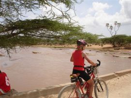 We left in convoy, this time to be able to take a group photo at the equator, which is just out of the town of Nanyuki. So we are half way around the globe, almost half way in number of cycling days and a little less than half way in terms of kilometres. The rotation of the earth gives a funny effect on water flowing through a funnel, on the northern hemisphere it goes clockwise, on the southern counterclockwise (or was it the other way around?) and someone was giving us a demonstration of it. Nice roads, but headwind and roads that go up and down. So we felt that a second breakfast with scrambled eggs and chips where needed to give us more energy. At the lunchstop later that day one of us had put her bike behind the truck, and found that her wallet disappeared when she got on her bike. So any future participants on the TdA, never put your bike out of sight when you have left bags, odometers etc. on it! The last part of the day (it was Saturday), we were accompanied by schoolboys on bicycles that came from school. Kenya has a very good developed English based, schooling system. Many people speak perfect English, so also the schoolboys with which we had an almost half hour conversation about our trip and their country. Their education is perfect, but the possibilities of finding a job are limited, so you meet people that have a degree at the university, but are selling fruit along the road as there is no work in their profession. As we are getting closed to Nairobi the traffic increases, and you have to pay particular attention to cars overtaking in the opposite direction, they do not leave you a lot of room and you need to get off the road quickly to avoid the worse. The campsite is the most beautiful we have had, green grass at the border of the river Tana, we all felt that we should take an extra rest day here (like we felt at the lake in Ethiopia). There was a possibility to do wild water rafting by moonlight; Jenny does not like water too much, but Kees decided to try it and he likes it! Especially the contrast between the very hectic parts where you are splashing down a waterfall and the parts where there you only quietly pedal over calm water, with bats and birds around you. There was an almost full moon, so that added a special touch to this very successful evening. Back to the top |