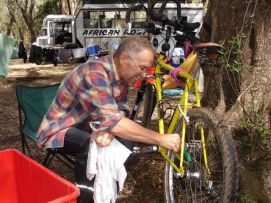 In the morning we made tea on the wood fire, what is that for a good start of the day in a jungle environment! On top of that the baboons played around the tents and close to the camp we saw about 8 elephants moving through the woods (unfortunately there was not enough light to take photos of them). We started the day with the regular process of cleaning ourselves, our clothes and our bicycles, went for a 2nd breakfast in a tiny restaurant and did some shopping to have an additional supply of food in case we do not like what has been prepared for all of us. Randy had proposed the day before we do a BBQ, type pot luck, so everybody buys there own stuff. We thought that it was too risky when we saw the butcher shops in town, so decided to go to a restaurant together with some others that also were not sure that our stomach would support the meat with flies! Back to the top |