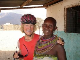 We started with 6 new people on the tour, those you already know are the van der Valk's who brought our new chairs. They brought so much stuff that they were having problems with KLM at check in, but they found a very creative solution for that. Their extra luggage was for a mission in Africa and the two chairs were for a missionaries to sit on. So Jenny and Kees are missionaries from now on! We also have a French couple, Madeleine and Christian, joining our group. Christian did the 2004 tour from Cairo to Addis and now wants to do the part from Nairobi to Windhoek. Madeleine is not cycling, but supporting her husband while riding the truck. When we started talking to each other we found out that we live 5 minutes away from each other as they also have a house at the Cote d'Azur! Jenny is no longer the eldest person in the group, Paul Westmattelman is doing the rest of the Tour that he started in 2005. We left camp in convoy, a long one again as Nairobi is a bit town. The convoy was not so hectic as on our way in the day before yesterday, but when we hit the smaller roads things became a bit hectic, a red car tried to pass us on the left site over the sand and rocks and threatened to get into our convoy when he saw that the shoulder of the road was no longer drivable. Our traffic enforcers (some of our fellow cyclist that kindly ask the drivers of the cars to wait a minute till we are all passed) did a good job in stopping him doing so. The road and the weather was beautiful, so most of us did not feel the 160kms was long. We stopped frequently to get a coke, once at a tourist shop where a big Mama was serving us coke and later at another souvenir shop, where the owner was a very friendly man. He has a daughter that we needed to take a picture from, you can see why! We also saw our first zebra, unfortunately it was a dead one, hit by a car alongside the road. The campsite near the border with Tanzania at Namanga was very nice, and the big surprise from Miles our chef was to have BBQ chicken, and fresh salada, we were delighted! "Where is the wine"; we hear you ask. No worries, it was there alright. A special wine! A former colleague of Priscilla from KLM was flying as stewardess on the flight to Nairobi with the van der Valks. She gave them a nice bottle of excellent South African white wine with which we completed our fine meal. Thanks Angelique! Back to the top |