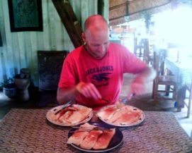 We did not want to work too much on the "rest" day, so as we managed to finish internetting yesterday evening, we gave the wash to a lady and took time to have a English breakfast and went to town to see if we can find a tent and some real food. We managed to get a tent, some nice things like muesli, mars bars and wine. On top of that the DHL office found our Visa cards, so in short this was a very successful day, we felt we deserved it after the last couple of difficult days with wet-tent-problems, illness etc. We also slept in a A-frame cabin, with lots of space and a real bed, what a luxury. We decided to "test" the new Visa cards and went to a recommended Italian restaurant Don Brioni's Bistro, together with our Dutch friend Geert-Jan and Judy. We had a very pleasant "European" evening with excellent food and South-African wine. Before and after the dinner, we where able to talk with our daughters, who called a public phone on the terrace. So this day was a successful day, also because on Internet we had 8 new photos from our grandson Christopher, who is already 6 months. We cannot wait to see him end of May! Some people are really hungry after all the cycling, 2 portions is often not enough as you can see! Back to the top |