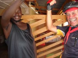 We got up early to try to beat the queue of people that might want to us the shower as we where using the room that had been made available to all riders to use the bathroom and to shower. Jenny left with Judy for the hilly day, as Kees had to take the truck, his stomach did not allow him to cycle unfortunately. Weather was misty, with several short rain showers. On top of that there was a strong headwind. Kees is glad he did not cycle, Jenny finished the difficult day, a lot of meters to clime ( >1800m). The campsite is on a soccer field near a school, amazing how easy people allow you to use that. That's Africa, in Europe we cannot see the local school allowing the pull in with 3 trucks, 70 people and a bunch of tents. On top of that we put a "fence" around our camp, to avoid hundreds of children to get too close to the tents. Here the principal comes with his guestbook and want you to sign your name as he is grateful we are using his soccer field! Along the road, in villages or bus stops, young people are making chips on a wood fire and a metal plate on which the fry the potatoes. When Jenny and Judy arrived, Kees had bought some and together with a Fanta, they celebrated their safe arrival. Many did not do the whole stage, so the were proud and they can be! Back to the top |