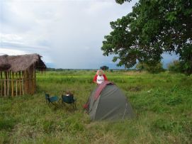 On rest days we have to take care of our own food, so breakfast, lunch and dinner. In the morning that is sometimes a challenge, as restaurants that offer breakfast are limited to those that are in a hotel. Especially on locations like the Chitima Beach, this creates a major problem, but Big Mike organized a wonderful breakfast at $2 each, with pancakes, French toast and omelet's. We hope that we can continue this habit, as we really need good food to be ready for the next couple of days. The facilities at the beach were limited, we only could get nachos with tomatoes for lunch (with a close to 2 hour wait!) and in the evening two pigs were roasted (numerous people felt ill the next day, including Kees). Jenny's bike got her first puncture on the rest day! When Kees deflated her back tire to clean the cassette and rim, the tube got a puncture after inflating, a small thorn, most likely already present before, was the reason. Her spare tube from the saddlebag was no longer good as well, the rubbing inside the bag had created a 3mm whole! We used our last unpatched tube from our stock, from now on we need to fix punctures on the road with the spare patched tubes. The score for +6000km is 3 on Kees' bike and 1 on Jenny's. Lets hope we can keep that score! The rest of the day we were playing games with blocks of wood and also saw a crab that was hiding between the inner and outer tent, luckily the tent was closed! Our tent gave up today, both zippers broke and we needed to use a tent from the truck from African Routes, unfortunately that tent was not waterproof, so water came in during thunderstorms, that went on all night. So our solid sleep hours were limited. We can assure you, this belated April fools day joke, did not amuse us at all. Back to the top |