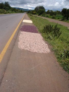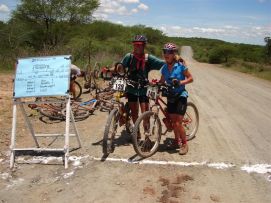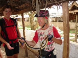 After such a long day we slept like babies. Jenny did a massage of Kees's knee that gave him a bit of a problem yesterday and also some Reiki. Surprise, surprise, no more pain! She herself also needed some massage, the nurse Jon did a short session during the riders meeting in the morning. Today we got sand, mud, stones, etc. Jenny thought that there was a new type of road almost every kilometer. On some of the houses/huts along the way we saw red crosses, we guessed that this was because they needed to be taken down. We got confirmation from one of the locals when we asked. In some villages we saw crossed on almost every other house! We reach the tarmac of Dodoma just before a thunderstorm flooded the area and we felt that it would be wiser to wait in a small restaurant than to get soaking wet! On the way into Dodoma, we were surprise to see vineyards, the evening we used to try to local wine, not too bad! A local rider helped cleaning the bikes and in compensation for his work we gave him one of our used tires. It is very difficult for the people here that like cycling to get good material. So they use every opportunity to get that from us. Back to the top |