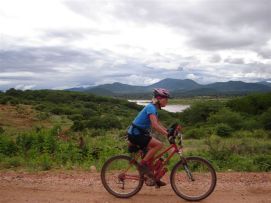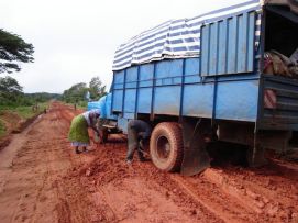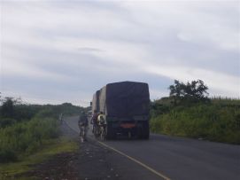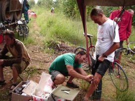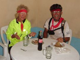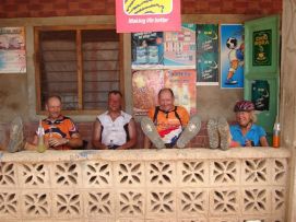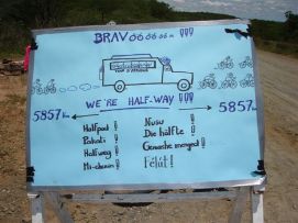 No rain during the night, but when we were taking our breakfast (porridge as usual) heavy rains started and we had to face a difficult start to say the least. Mud, mud and mud! After 45 minutes Jenny almost decided to stop as it was very difficult to get through on our bikes. We kept trying however and the roads improved a bit. We came through a village where the road has changed into a river, but then we got on better road and the rain stopped as well. After 2 hours, we almost had forgotten the very difficult start of the morning. Almost forgotten as we still can see ourselves wading through the mud in some places. Randy told us the day before that we will see lakes, among others an artificial lake with a dam. Just before the dam we had a nice Coke. The dam itself we were not aloud to photograph, apparently they are afraid that someone will rebuild a similar one? Big Mike, Huberte and Madeleine had prepared a surprise for us. We passed the halfway mark at 5857km, and Mike had bought a lot of excellent food, among others fresh fruit like pineapples and coconut. We stayed longer at that lunchstop because of that! One more Coke stop, this time with the other Dutchies (www.3opdefiets.nl) and when we arrived at the camp we had surprise number 2 of the day, BBQ! We should have complained about the food a bit earlier in the Tour! Back to the top |