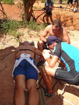 After a short convoy we reached the dirt road again and decided that today we would like to get pictures from the locals. That is not always easy, the guy that was next to the stack of charcoal, only wanted to be on the photo if we gave him money, so we only took the photo of the charcoal. Others were more willing to get their picture taken as you can see. One of our riders hit the dirt pretty rough and needed to be stitched up by the surgeon. He was not the first one, we have had two more cases of riders that fell of their bikes and needed stitches. We also have a total of 12 riders that are no longer on their bikes in this part of the Tour. That's almost 20%, we feel proud and lucky that we are still able to continue to cycle. Our surgeon Thobias has a lot of work this way, but fortunately also finds time to ride his bike himself. As a little thank you to all the assistance he is given, here a picture of him going of the rough roads in Tanzania. We hear more and more riders complaining about the food. The food in the evening is ok, but not with a lot of fantasy, almost always stew, with curry and little or no fresh vegetables. Leftovers from the day before are often used as a spread on the bread for the lunch the next day. We stay away from that as we think that stomach problems in our group are perhaps related to that. So we take some tins of sardines with us and make our own bread. The afternoon and evening was hot, so hot that we tried to stay outside of our tent as long as possible. The sky was beautiful, clear with stars, but all around us we saw lightening on the horizon, so it was like watching fireworks. The next day we would see if the thunderstorms would come our way or not! At 9:00pm in our tent the temperature was close to 30 degrees, difficult to go to sleep. In the small town close by, the people were playing the drums and children were signing, so we finally got to sleep on the sweet sound of their voices. Back to the top |