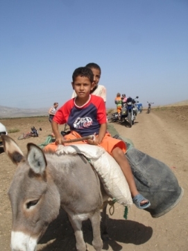 Notre campement était sur le parking d’un hôtel, à proximité de la route. Comme nous ne voulions pas être réveillé par le bruit des voitures, nous avons loué une chambre. Nous avons très bien dormis, malgrès le fait que cette chambre n’avait pas de fenêtres. Jusqu'au déjeuner nous avions un vent frontal, ainsi la plupart d'entre nous, y compris Jenny et moi, étaient assez fatigués arrivant après 80 kilomètres. Sur la route, plusieurs autobus avaients décidé de nous dépasser à moins de 10 centimètres de près. Pas très plaisant mais heureusement nous avons survécu. Les tas de foin (voir la photo) ressemblent à de petites maisons: le toît est aussi fait de foin, mais très probablement imperméabilisé avec la bouse de vache. L'eau ici est transportée sur les dos d'ânes. Un moyen de transport qui demeure très populaire ici. Les enfants demandent de l'argent, ou des stylos à bics. Quand j’ai dit à un petit garcon que je n’avais pas de bics, il m’a repondu "OK, alors donne moi ton vélo"! Un peu plus tard, pendant une montée, une petite fille me demandant de l'argent, a voulu saisir mon guidon. J’étais furieux et j’avais besoins de boire un Coca Cola pour me calmer. Près de Volubilis, où il y a des restes d'une ville Romaine, nous avons vu cette belle ville près d'un fleuve. Nous sommes arrivés tôt au campement, pour découvrir qu'il n'y avait pas d’électricité ni d’eau courante. L'expérience Africaine continue! Retournez au-dessus |
