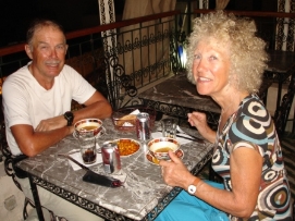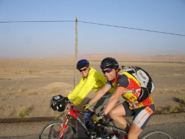 La dernière étape avant notre jour de repos. Comme nous avions une courte journée hier, aujourd'hui il était d’atteindre le sommet du Tizi-n-Tichka. Sur 260m il fallait monter 2260m! Après une réchauffante montée, nous avions une superbe déscente vers Marrakech. La dernière partie,était moins intéressante car il y avait beaucoup de circulation et les autobus et camions nous dépassaient de très près. Jenny et moi avons décidé de célébrer notre anniversaire de mariage ici. Nous avons ainsi une chambre au MERIDIEN pour ce soir et demain soir. Participants Paul a eu un accident le 6 Octobre, mais heureusement il peut continuer l'excursion. Notre infirmièr Didier sera remplacé à Marrakech. Nous avons vraiment été ravis de l'avoir parmis nous. Il a beaucoup d'expérience et a fait du bon travail. Il était toujours prêt à aider, comme quand Jenny s’était blessés. Lisette est une cycliste très forte, elle est souvent la première à arriver au campement. Elle donne aussi souvent un coup de mains dans la cuisine. Seppo s’est joint à nous à Grenade et nous quittera à Marrakech. Il avait aussi fait une partie de Paris-Dakar l'année dernière, donc peut-être il finira à Dakar l'année prochaine? Vous avez aussi déjà vu Andy, mais pas dans cette position, fatigué après une journée sur sa moto et essayant de finir son histoire sur son ordinateur. Wim est le cycliste le plus âgé dans le groupe car il a 67 ans, mais il est très rapide. Nous avons énormément de respect pour lui. Quand il s’est blessé au dos en France, il a quand même continué malgrès la douleur. À côté de lui (sur la photo), il y a Elleke. Ils pédalent la plupart du temps ensemble. Matthew est l'un des participants le plus jeune. Il est très fort et il a gagné avec Paul le Team Time Trail. Sa petite amie Sophie l’a visité pendant la plupart des week-ends en Europe, elle le rejoindra pendant une semaine à Marrakech. Andrea et Beat, les cyclistes Suisses qui se sont joints à nous à Grenade, retournent à la maison à Marrakech. Beat n’a pas eu de la chance car il a eu des problèmes avec sa cheville et a aussi eu des problèmes d’estomach. À plusieurs reprises, Andrea a pédalé avec nous quand Beat ne pouvait pas la joindre. Anne est notre conducteur de camion Danois et l'épouse d'Adam. Elle est très forte à reparer les moteurs et elle nous prépare de temps en temps un très bon potage que nous dégustons en arrivant au campement. Retournez au-dessus |