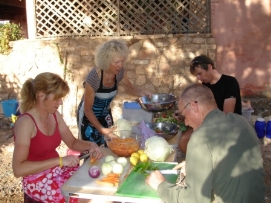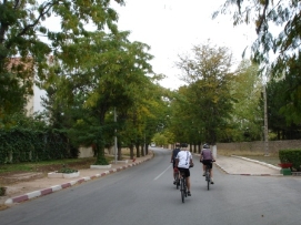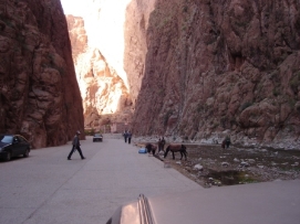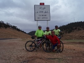 Aujourd'hui, il y avait la Team Time Trial (une épreuve en groupe). Jenny et moi n’avons pas participé, mais nous avons vu les autres nous dépasser à grande vitesse. Paul et Matthew ont gagné l'épreuve et Arnoud et Marius étaient surpris d’avoir une 3ème place. L'étape entière était plutôt rapide car nous avions fini en arrivant à notre déjeuner. C’est la deuxième fois (la première fois était en France après avoir quitté Paris) que nous avons déjeuné avec tous les autres cyclistes. Aprés le déjeuner, nous sommes tous allés à la Gorge de Tondra, où nous avons pris une photo du groupe. Au bord de la route, des femmes étaient entrain de colorer des tapis et vêtements. Je ne pouvais pas prendre des photos de plus près car ce n’est pas permis par leur religion. Du terrain de camping, nous avons pris un taxi pour aller à la Gorge. Les paysages étaient magnifiques. L'hiver dernier un partie de la route a été démoli par une inondation et 120 maisons étaient détruites. Demain, nous commencerons 3 longs jours avant d’arriver à Marrakech. Retournez au-dessus |