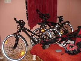 Pendant la nuit, le gradient écoutait sa radio. Même si ce n’était pas trop fort, c’était assez fort pour réveiller certains. Mes bouchons pour les oreilles sont formidables dans ces cas là. À 4:50 le mujadin commencé sa prière de matin avec le bruit habituel, annonçant que tous les musulmans ne devraient plus boire ni manger. Nous avons commencé notre petit déjeuner à 5:30 et sommes partis 45 min. plus tard. Andrea et Beat se sont joints à nous, apparement ils se sentaient plus comfortables avec nous car ce n’est pas la première fois que nous pédalons en Afrique. Qu'est ce qui a changé depuis l’Europe? Tout d'abord, les cyclistes, comme des piétons sont tout en bas de l'échelle dans la hiérarchie de la circulation. Il faut ainsi faire très attention quand les camions ou les autobus nous dépassent. Beaucoup de personnes sont en effet très enthousiastes, mais quelques enfants ont aussi commencé à nous jeter des pierres. Nous avons eu deux bonnes rencontres, d'abord avec des enfants partant de l'école puis avec un homme qui accompagnait sa mère sur un âne. Il est professeur d’ Anglais, mais à cause du Ramadan, son école est fermée. Retournez au-dessus |