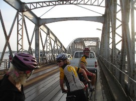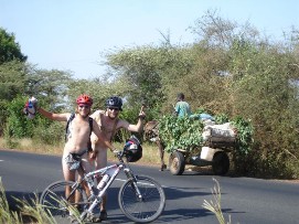 The start of the last stretch to Dakar, only 3 easy days and we will find ourselves at the end of this tour. We left St. Louis over the bridge that once was designed by Gustav Eiffel and originally was built to cross the Danube. As mentioned in the last report, the bridge needs a lot of maintenance, and has an iron pavement with plenty of holes in it. On top of it the bridge was wet in the morning, and was very busy. We took good care not to fall down, especially Jenny who was still struggling with the injury she got in Nouakchott. She decided to walk the last 50 meters, which naturally was not appreciated by the cars that were queuing behind us. We saw more and more Baobabs, one was rather bulky, we have seen bigger Boababs but felt that this one was worth a picture, as well a the boy that came to see what we were doing. We took a very long lunch today. The reason was that Marius wanted to wait to see how Arnoud was doing, as he had cramps again. It's remarkable that he is still able to cycle all the stages up to now. At this lunch stop kids came to see us. Contrary to what we experienced in Morocco and Mauritania, the children here are not a nuisance, they wait until you invite them to come closer. One of them was riding a donkey, and although the way they threat animals here in Africa is not always appreciated by some of us, the had a good relation with the donkey. We gave the kids the postcards from Paris Dakar by Bike and he showed the donkey the picture and put two of them on the site of his head as a kind of protection for his eyes. A bit futher on the road Marius saw that the canvas that is attached (was actually!) to the green truck, was hanging in a tree. We called Wilbert to make him aware of it and fortunately the crew was able to get it back! It could have been worse, first of all the canvas could have hit another car or pedestrian/cyclist, but secondly it was by pure chance that their were not too many houses around, otherwise it could have disappeared and be used by one of the locals. One more “interesting” experience to end the day. When we wanted to put our tent up, we found that “something” had happened with our 2nd tent. Most likely because of a burning cigarette, our tent became unusable. Had this happened in the truck, Adam was sure it had not, but bottom line was that we now had one tent with a broken pole and one with holes in it. Rudy lent us a spare tent and as we only had 2 more nights to go, we left it at that. Next time we take 3 tents with us, just to be sure... Back to the top |