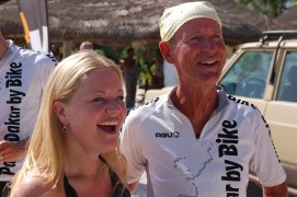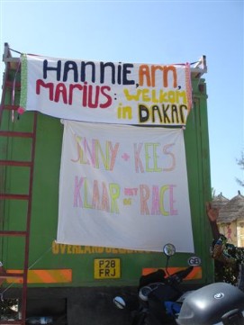Just before the sun appeared, I went to take a swim in sea and as there was nobody on the beach, decided not to use my swimming trouser and leave tht with my slippers and towel on the beach. When I got out of the sea, I saw one of the dogs that were lying on the beach running away with my trouser! So I ended up running naked of the beach to get my belonging back! So no naked mile fo me, but at least a naked run of a couple of hundred meters. I got it back, the dog finally decided to let go. The last part of our tour was easy as easy could be. Only about 80km, so our departure was scheduled for 9:00am with a long lunch and a nap before we went for the last 20km to the finish in Dakar at Lac Rose. The place where the car rally also stops. The convoy was nice, a maximum speed of 15km/h, a lot of chatting, shaking hands and making compliments to each other. It is nice to hear that young people feel we have inspired them as “oldies” to be able to do the 7200km. Arriving all together at the hotel at Lac Rose was a big surprise. Djembe music, and Priscilla en Lucien standing their with a banner saying “Jenny and Kees have finished the Race” . Priscilla surprised us with two bottles of champagne, that we opened a gladly shared between all of us! For Hannie and Marius there was a big surprise as their daughter had unexpectedly decided to welcome them in Dakar! |