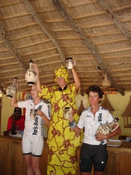And the winners are! John from New Zealand and Mieke from Holland! See www.bike-dreams.com for more details about the results if you are interested in it. Just for the record, I were able to do the tour in 334 hours and 24 minutes. Because Jenny was in the truck for 4 days (4 times 12 hours penalty) and the fact that she did not participated in the time trail, her time is higher, 360 hours and 45 minutes. Personally we think that we are all winners, winners of daring to start this trip in Paris, not knowing exactly what to expect, and winner to be able to get all the way to Dakar by just pedaling through wind, rain, heat, dust and some boring stretches in the desert. Our price was that we were able to finish this trip and we got our personal price from our children, two nice bicycles made in Africa! In the evening we had a very special meal, sitting in tents and having fun with the music and the dancing. Not easy to believe that after 10 weeks together we will each go our way. We have made some very good friends and will continue to try to keep in touch with each other, but know from experience that most of us will never see each other again. Back to the top |