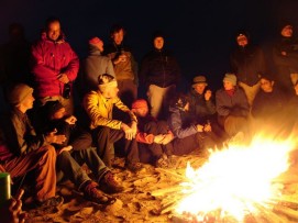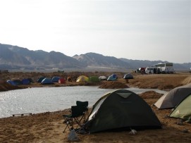It can be cold in January in Egypt, the wind continued blowing the whole night and the morning was cold, so we left as soon as we finished breakfast, 10 minutes before the official start. Our plan to get up early (5:30) worked. Like yesterday a good tailwind, so we got our lunch stop already at 10:30. Although we did not feel hungry, we tried to get our calories into our bodies and off we went for the finish at 13:00. Our timekeeper Rita told us that again the police wanted us to go further, but that she managed after 45 minutes of negotiating to get a wonderful campsite near the sea. The captain of the police even arranged for a campfire before, during and after dinner. Before dinner, many of us took a refreshing dive into the sea. The scenery here is beautiful, with all kind of colours of sand and rocks, with the sea near by, we will miss this till we end up in Namibia! The dinner next to the campfire was excellent, a kind of lentil's stew with bread. After 3 days pedalling, we wonder where wildlife is, we see no villages either, only checkpoints. The people are quite friendly, they salute you when you pass, trucks and cars are honking when they overtake you and often wave at you. The scenery of the roads so far have been a western movie (sand, dunes, rocks) on the right and most of the times the sea on the left. Back to the top |