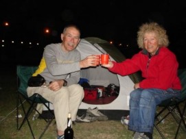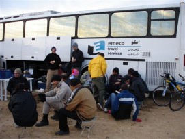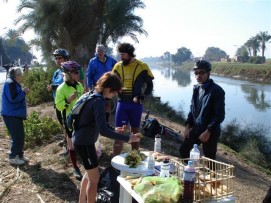 We did not sleep long the night before, first of all because we had a dinner on a Nile cruise boat. Jenny went belly dancing, she was almost forced into it by the entertainers. Secondly we needed to get ready with all the luggage and thirdly we were a bit nervous for the start. We were told that our luggage needed to be loaded on the bus at 07:00, but we are in Africa, so the buses were late, but with the help of almost everybody we got them loaded on time and left for the first 9 km's to the pyramids, where officials did a short speech, Jenny was interviewed by the press and off we went for 12.000km to Capetown. For the first part we where in hectic traffic, but after about a hour we came of the major highway and headed for the Red Sea. Police is all around us, in cars, on motorcycles and on the side of the road. They love to show off sounding their sirens. We had expected to do 130km's that day, but the police did not approve the campsite and we finally had to do 148, not something we liked, but we are in Africa you know. The campsite was alongside the road, between some unfinished buildings, one of which was inhabited by some dogs, who welcomed us. Nice, but unfortunately they decided to continue with that until we left the next morning. There were no toilet and washing facilities, so we cleaned ourselves with wetties and had our first camp dinner sitting next to the bus. Before that we had Randy announcing the winners of the day, Peter and Joan, and the tour for tomorrow. Because we cycled more today, we will only do 140 km tomorrow . Never believe a tour leader at first sight! Back to the top |