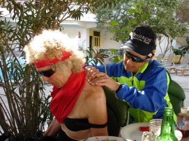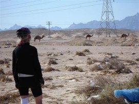 The night was windy (again!) but the sunrise was beautiful, we left 10 mins early to get warm, standing in the open field having breakfast with a chilly wind blowing your socks of, is not our cup of tea! We were passed by the group quickly, but just before the checkpoint saw them standing on the site of the road. Phillipa from South Africa was on the pavement, she collided with Irmie while cruising at 35km/h, crashing her helmet and rim. At first it looked bad, but fortunately she was able to continue on the bike of Jon, the nurse. Finally we saw some wildlife: Camels! Everybody stopped to take video and pictures. The finish in Safaga came earlier then expected. With a couple of other folks we went to a nearby hotel. Our luggage was put into the little van and we followed by bike. A policeman did not want us to continue, but we really felt that we had enough of police intervention and we ignored him. The force of the masses! I also got a change to test the Dazer, it worked like a marvel! A mad dog immediately stopped his attack when I pointed the machine with the ultrasonic sound on him! We had a nice quiet afternoon, did the washing, dried it in the room (what a mess!) and had a buffet dinner in the hotel with the others. Back to the top |