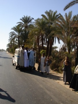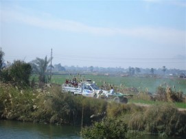 Waking up at 5:00 from the loudspeakers of the minarets, announcing the start of the day is not our preferred way! We might better get used to it in the countries we go through where the Islam is the most spread religion. It was not cold this morning and we had the same policeman driving next to us over the bridge back to the main road to Aswan. A lot of traffic today, especially when we got close to Aswan, sometimes we got close to the river Nile and there we saw the sailing boats and could make postcard pictures and video. The harvest of sugar cane is in full swing, so plenty of cars with mules and also trucks. Close to Aswan a large factory was working full speed.