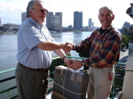 A lazy morning with a gorgious breakfast and then getting a taxi to get to fetch our box with 10 kg of spareparts (see first Newsletter). We called Albert, who now lives in the house of Charles he explained where he lives and after an adventourous drive through Cairo we where able to fetch our box. The story with the box does not seems to have an end! We took a taxi back, but the driver could not find the hotel. With the help of the receptionist of the hotel that we called, we finally made it. Then the driver had no change, so Jenny stayed in the taxi and I got change in the hotel. We got out of the car and last minute Jenny cried "The box is still in the car!" That would have been a disaster, after so much effort to loose the spareparts like that! Back to the top |
