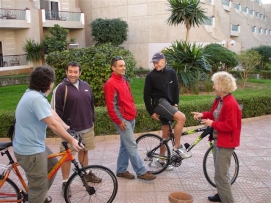 It worked out well, these boxes were taken for granted. What almost did not work was the visa for Egypte, or actually the absence of it. We were informed that you buy the visa at entry in Cairo, but the fact that we enter Egypt by air and leave by bicycle confused the person responsible for getting us on the flight. She had to call 3 times someone else in order to get the green light, it took us close to 45mins to get our boarding cards! This is the interesting part of live, you worry about having to pay excessive kilos and you get surprised by a very precise checking of the visa! Al, our "chauffeur" got worried as well, looking to us from a distance, but we were all happy when we got our boarding cards, we can tell you.The flight was quick and easy, we celebrated our departure with a glass of wine, what else can you expect from some francofile Dutchies! The wine had a very appropriate name, Dusty Road. Heathrow! Those that have made an international connection know that it takes time to go from T1 to T4, but we were not pressed for time, so we enjoyed looking around, meeting people, like an old colleague from Digital that I hadn’t seen for say 10 years, and a First Aid guy on a bicycle! Could not have been more appropriate, we asked him if he could join us on the trip. Just before boarding we checked if all our 4 pieces of luggage where on board, we were told the bags were on, the bicycles not, so we waited boarding to see what was happening and got the relaxing message that they are on the plane. We also met two other cyclists from England when boarding, they recognised us from the webpage, we start to become famous! The planeride was rather long, we boarded on time, but left almost one hour later due to traffic congestion, we love Heathrow! At the airport in Cairo, we met 2 other participants, one from Denver and one from San Fransisco. The 6 of us went into the bus of the tourist company and got our first impression of Cairo, hectic situations on the road, people passing left and right, pedestrians crossing and narrowly escaping to get their toes cut off (or worse), so a good warning sign for us getting to meet this traffic on our bicycles soon. Around midnight we arrived in the hotel, got our keys after we paid our room cash in American Dollars and decided to get a drink and some food in the bar. That ended up being a good plan, more cyclists joined and also our tourleader Randy. A nice little group was formed. During the conversations with our fellow riders, we felt good that everybody had the same anxiety about the feasibility of being able to complete the tour. We ended up going to bed at 3:00am, a good start of our holiday. Back to the top |