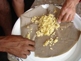 We had a terrible night, almost the whole night there was priest on a loudspeaker on a Coptic church praying and singing songs! We think God is going to love this guy, but we could kill him! We left in convoy, as always after a rest day and had to go through a very busy city with lot of traffic jams and worse, lot of fumes from the exhaust pipes. As a tip for next years participants, take mouth caps with you to wear them when you are in this situation, it might keep you healthier. Two local riders helped guiding us our of town, and we also have a new rider from Belgium, Rudi (who btw brought us the spareparts and also some clothing for Jenny and our favorite tea, Rooibos. Thanks Rudi!) The landscape did change a bit, would say more tropical, but also richer, as there was much more industry down south of Addis. But we still saw the monkeys with their loads, often walking on their own, while their master is still drinking coffee in the local pub. Houses are as before, not very hygienic, but they clean the ground in front of their house, while next to their house they leave the cartons, tins, papers, etc. just as it is! Handshaking in Ethiopia is not complete with touching each others right shoulder afterwards, for the man that is. Alongside the road the plastic bottles/containers were sold wrapped in rope. We only saw that on the road out of Addis, elsewhere they were just plastic and clear visible on top of the many busses that are passing us. After a while we turned right, direction Shashemene, the rastatown where they adore Bob Marley. That road goes alongside a couple of lakes and we saw more birds, among others the Maribo. The area is rich on grass here, we could see that from the many haystacks next to the huts. Almost at the end of the day we meet Mihad, our cyclist from Sudan, who invited us to eat the local food (indura), that was prepared in the kitchen behind the pub. The camp was nice in the middle of nowhere, but even there we got a lot of spectators, just watching us. Only a couple of days more, this phenomenon will disappear in Kenya we have been promised! Back to the top |