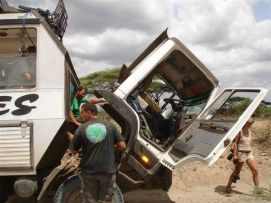 The roads became very bad after leaving Laisamis, stones, sand, and on top of that very hot! The bridges we crossed where a river was supposed to flow were completely dry. Women were trying to get some water by digging a big hole into the river bed and getting some last drops out of these "wells". We feel ashamed that we can get just the water from our trucks and do not have to look for water ourselves (watch the contrast on the photo!). Often we are asked by children on the road if we would be willing to give them a bottle of water. Difficult to ignore that request, but if you start with one, you will have the whole village coming to you! The water situation in North Kenya is really bad, we spoke to several people on the road, for instance with a farmer who was sitting on that same bridge where the photo was taken and told us that during the last 3 years his livestock when back from 200 to 50 cows, most of the 150 were dying because of the draught. Agriculture is close to impossible due to the lack of water, so people here try to survive with their cows and goats. Back to the top |