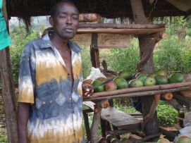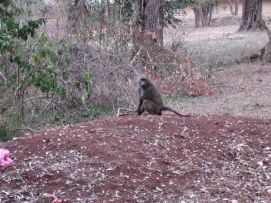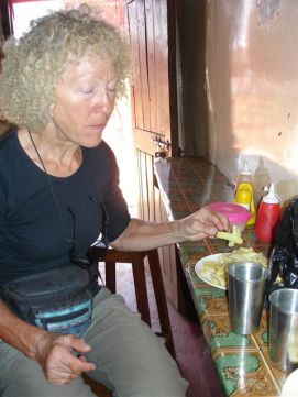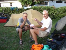 In the morning we made tea on the wood fire, what is that for a good start of the day in a jungle environment! On top of that the baboons played around the tents and close to the camp we saw about 8 elephants moving through the woods (unfortunately there was not enough light to take photos of them). We started the day with the regular process of cleaning ourselves, our clothes and our bicycles, went for a 2nd breakfast in a tiny restaurant and did some shopping to have an additional supply of food in case we do not like what has been prepared for all of us. Randy had proposed the day before we do a BBQ, type pot luck, so everybody buys there own stuff. We thought that it was too risky when we saw the butcher shops in town, so decided to go to a restaurant together with some others that also were not sure that our stomach would support the meat with flies! Back to the top |