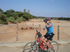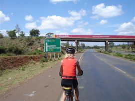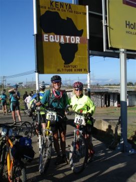 We left in convoy, this time to be able to take a group photo at the equator, which is just out of the town of Nanyuki. So we are half way around the globe, almost half way in number of cycling days and a little less than half way in terms of kilometres. The rotation of the earth gives a funny effect on water flowing through a funnel, on the northern hemisphere it goes clockwise, on the southern counterclockwise (or was it the other way around?) and someone was giving us a demonstration of it. Nice roads, but headwind and roads that go up and down. So we felt that a second breakfast with scrambled eggs and chips where needed to give us more energy. At the lunchstop later that day one of us had put her bike behind the truck, and found that her wallet disappeared when she got on her bike. So any future participants on the TdA, never put your bike out of sight when you have left bags, odometers etc. on it! The last part of the day (it was Saturday), we were accompanied by schoolboys on bicycles that came from school. Kenya has a very good developed English based, schooling system. Many people speak perfect English, so also the schoolboys with which we had an almost half hour conversation about our trip and their country. Their education is perfect, but the possibilities of finding a job are limited, so you meet people that have a degree at the university, but are selling fruit along the road as there is no work in their profession. As we are getting closed to Nairobi the traffic increases, and you have to pay particular attention to cars overtaking in the opposite direction, they do not leave you a lot of room and you need to get off the road quickly to avoid the worse. The campsite is the most beautiful we have had, green grass at the border of the river Tana, we all felt that we should take an extra rest day here (like we felt at the lake in Ethiopia). There was a possibility to do wild water rafting by moonlight; Jenny does not like water too much, but Kees decided to try it and he likes it! Especially the contrast between the very hectic parts where you are splashing down a waterfall and the parts where there you only quietly pedal over calm water, with bats and birds around you. There was an almost full moon, so that added a special touch to this very successful evening. Back to the top |