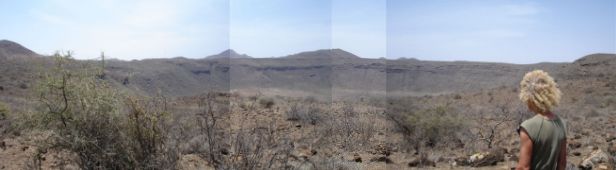 The group started at 7:00 and some even earlier. The road looked like yesterday afternoon, but on top of that there was a lot a headwind, so we were glad that we took the decision to ride the truck. The environment is really dry as dry can be, with again many dead goats and cows alongside the road. After we passed the lunch truck we saw two immense craters of old volcano's, wonderful panoramas.