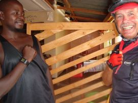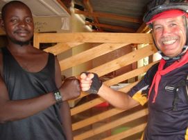 We got up early to try to beat the queue of people that might want to us the shower as we where using the room that had been made available to all riders to use the bathroom and to shower. Jenny left with Judy for the hilly day, as Kees had to take the truck, his stomach did not allow him to cycle unfortunately. Weather was misty, with several short rain showers. On top of that there was a strong headwind. Kees is glad he did not cycle, Jenny finished the difficult day, a lot of meters to clime ( >1800m). The campsite is on a soccer field near a school, amazing how easy people allow you to use that. That's Africa, in Europe we cannot see the local school allowing the pull in with 3 trucks, 70 people and a bunch of tents. On top of that we put a "fence" around our camp, to avoid hundreds of children to get too close to the tents. Here the principal comes with his guestbook and want you to sign your name as he is grateful we are using his soccer field! Along the road, in villages or bus stops, young people are making chips on a wood fire and a metal plate on which the fry the potatoes. When Jenny and Judy arrived, Kees had bought some and together with a Fanta, they celebrated their safe arrival. Many did not do the whole stage, so the were proud and they can be! Back to the top |