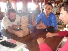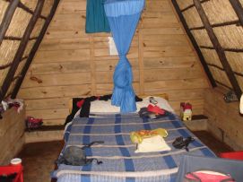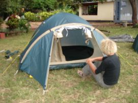 On rest days we have to take care of our own food, so breakfast, lunch and dinner. In the morning that is sometimes a challenge, as restaurants that offer breakfast are limited to those that are in a hotel. Especially on locations like the Chitima Beach, this creates a major problem, but Big Mike organized a wonderful breakfast at $2 each, with pancakes, French toast and omelet's. We hope that we can continue this habit, as we really need good food to be ready for the next couple of days. The facilities at the beach were limited, we only could get nachos with tomatoes for lunch (with a close to 2 hour wait!) and in the evening two pigs were roasted (numerous people felt ill the next day, including Kees). Jenny's bike got her first puncture on the rest day! When Kees deflated her back tire to clean the cassette and rim, the tube got a puncture after inflating, a small thorn, most likely already present before, was the reason. Her spare tube from the saddlebag was no longer good as well, the rubbing inside the bag had created a 3mm whole! We used our last unpatched tube from our stock, from now on we need to fix punctures on the road with the spare patched tubes. The score for +6000km is 3 on Kees' bike and 1 on Jenny's. Lets hope we can keep that score! The rest of the day we were playing games with blocks of wood and also saw a crab that was hiding between the inner and outer tent, luckily the tent was closed! Our tent gave up today, both zippers broke and we needed to use a tent from the truck from African Routes, unfortunately that tent was not waterproof, so water came in during thunderstorms, that went on all night. So our solid sleep hours were limited. We can assure you, this belated April fools day joke, did not amuse us at all. Back to the top |