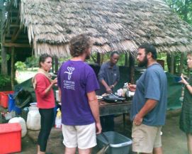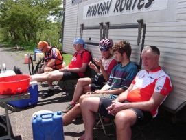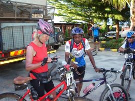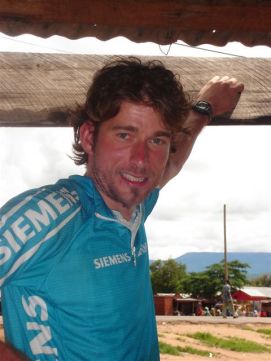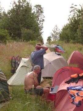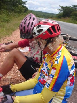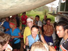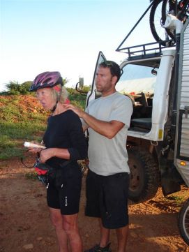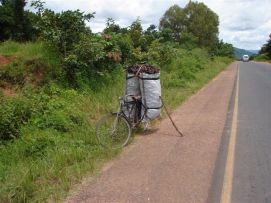 No rain during the night, but when we were taking our breakfast (porridge as usual) heavy rains started and we had to face a difficult start to say the least. Mud, mud and mud! After 45 minutes Jenny almost decided to stop as it was very difficult to get through on our bikes. We kept trying however and the roads improved a bit. We came through a village where the road has changed into a river, but then we got on better road and the rain stopped as well. After 2 hours, we almost had forgotten the very difficult start of the morning. Almost forgotten as we still can see ourselves wading through the mud in some places. Randy told us the day before that we will see lakes, among others an artificial lake with a dam. Just before the dam we had a nice Coke. The dam itself we were not aloud to photograph, apparently they are afraid that someone will rebuild a similar one? Big Mike, Huberte and Madeleine had prepared a surprise for us. We passed the halfway mark at 5857km, and Mike had bought a lot of excellent food, among others fresh fruit like pineapples and coconut. We stayed longer at that lunchstop because of that! One more Coke stop, this time with the other Dutchies (www.3opdefiets.nl) and when we arrived at the camp we had surprise number 2 of the day, BBQ! We should have complained about the food a bit earlier in the Tour! Back to the top |