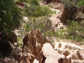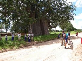 Well, the bikes were wet, but not clean at all. So before we left we had to clean the chains and lubricate them, so we left camp after the racers were gone, we catch them later…… The condition of the road were reasonable compared to yesterday at first, but later became as disastrous for us as the day before. Our trucks had to wait because another truck got stuck in the mud. We never had been so late at lunch, only at 1:00pm and afraid that we might not be able to get to camp before dark. There was a beautiful tree, the baobab, next to the lunch location. The trunk was enormous; we think that 20 people would be needed to circumvent it. We left after 30 minutes, knowing that the roads were less hilly after lunch. Some of the landscapes were nicely formed by the water, could be a good inspiring picture for a future paintings by Jenny. Well we made it to camp, but we had to push the limits on our pedals. We were just in time to eat and wash a bit with a bottle of water and sleep to become strong for the next day. Back to the top |
