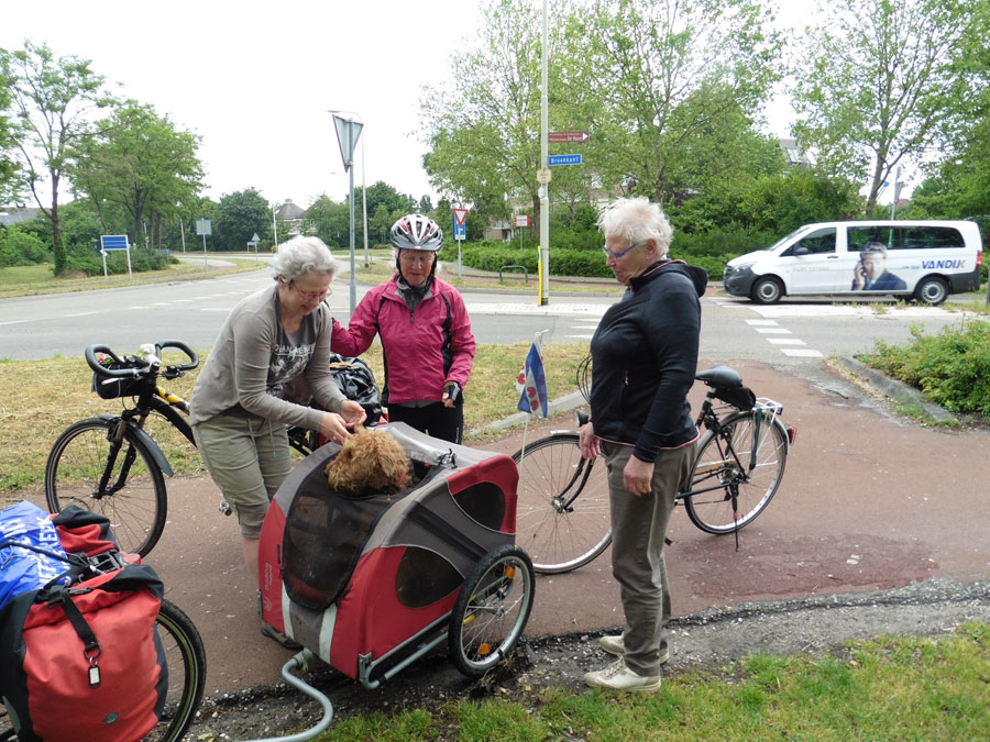 Af en toe een spatje regen tot nu toe, maar bij Hemelum ging het mis, de regen kwam horizontaal aanzetten en is eigenlijk niet meer opgehouden tot Makkum. De geplande stop in Workum bij de biowinkel van Pleunie hebben we maar overgeslagen, bang dat we doordat we doornat waren, kou zouden vatten.
