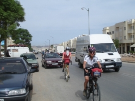 Pendant la nuit, le gradient écoutait sa radio. Même si ce n’était pas trop fort, c’était assez fort pour réveiller certains. Mes bouchons pour les oreilles sont formidables dans ces cas là. À 4:50 le mujadin commencé sa prière de matin avec le bruit habituel, annonçant que tous les musulmans ne devraient plus boire ni manger. Nous avons commencé notre petit déjeuner à 5:30 et sommes partis 45 min. plus tard. Andrea et Beat se sont joints à nous, apparement ils se sentaient plus comfortables avec nous car ce n’est pas la première fois que nous pédalons en Afrique. Qu'est ce qui a changé depuis l’Europe? Tout d'abord, les cyclistes, comme des piétons sont tout en bas de l'échelle dans la hiérarchie de la circulation. Il faut ainsi faire très attention quand les camions ou les autobus nous dépassent. Beaucoup de personnes sont en effet très enthousiastes, mais quelques enfants ont aussi commencé à nous jeter des pierres. Nous avons eu deux bonnes rencontres, d'abord avec des enfants partant de l'école puis avec un homme qui accompagnait sa mère sur un âne. Il est professeur d’ Anglais, mais à cause du Ramadan, son école est fermée. Retournez au-dessus |