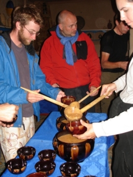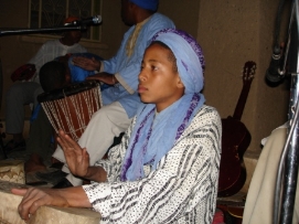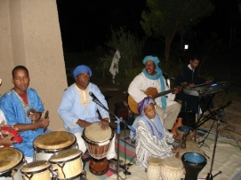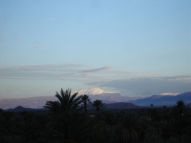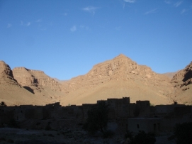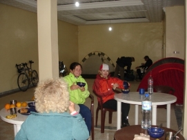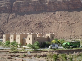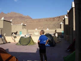 Après une bonne nuit de sommeil, un bon petit déjeuner et un départ un peu retardé (7:30 à la place de 6:00), nous étions prêts pour une nouvelle journée. La route était magnifique avec la vue sur les montagnes enneigées et ensoleillées. Pour la première fois, des enfants nous embêttaient pendant notre déjeuner, mais Didier faisait de son mieux pour les chaser. Il est compréhensible que ces Européens à vélo sont très interessants. Après un petit tunnel, construit par les Légionnaires, nous sommes arrivés au campement ou plus présicement au Kasbah. Comme nous nous sentions faibles et fatigués nous avons décidé de dormir dans un vrai lit une fois de plus. Les draps n’étaient pas très propres (le couple avant nous n’avait pas seulement utilisé le lit pour dormir…) et l'eau dans la douche avait décidé de s'arrêter quand Jenny avait le cheveux pleins de shampooing! Nous sommes vraiment en Afrique! Le dîner aujourd'hui était préparé par l’ hôtel: du couscous avec un potage. Après le diner, il y avait une surprise: un groupe de musiciens local a joué et ceux qui avaient toujours assez d'énergie, ont décidé de danser. Jenny et moi avons aussi dansé. Retournez au-dessus |