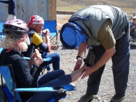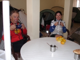 Vu que nous avions une montée de 2000m devant nous aujourd'hui, nous avons décidé de commencer tôt. Comme nous avions dormis dans le Kasbah, ce n'était pas trop difficile pour nous, mais pour ceux qui avaient dormis dans leurs tentes, c’était une toute autre histoire. Il y avait eu un orage avec une tempête de pluie pendant la nuit, beaucoup étaient trempés. Rik, qui avait mis sa tente sur le toit plat du Kasbah, s'est retrouvé dans une piscine. "Tout est mouillé" il m’a dit "ma tente, mes vêtements et moi-même". Ces derniers jours, beaucoup de personnes sont tombées malades. Aujourd'hui 7 personnes sont restées dans le bus, ce qui est un record. L'organisation avait une surprise pour nous. À la place d’un campement en plein nature, ils avaient organise une campement dans un batiment vide tout près des boutiques de souvenirs. Rudy nous a préparé un excellent repas et nous avons celebre les 4000km que nous avons dépassé aujourd’hui. Retournez au-dessus |