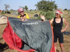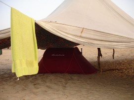 It was again one of those easy days of which we seem to get the hang of it. Interesting to see that at the beginning of our trip we sometimes were a bit under stress; cleaning the bikes, cleaning the clothes, preparing the Newsletter, selecting the photo's, etc. In Africa you can find much more easily someone to do part of the work for you, we often gave our clothes to be washed by someone from the hotel, and the most important part of the bicycles that we cleaned were the chains, the rest we dusted off and will wait till we are back home to do an intense cleaning. We stayed in a nice hotel in St. Louis, it looked a bit like pictures of hotels we have seen from the Antilles. St. Louis is the old colonial capital of the former French Western Africa colony. You can still see that easily by the way the city is build. In one of the hotels of the town, La Residence, we took our lunch. Before that we had a not so nice experience that fortunately could have been worse. When leaving the Internet café were we send our 14th Newsletter to Lucien, our web master, we were kind of blocked by two men, one tried to get me interested in a MP3 player and when I said that we were not interested the other man stepped on my foot, pretending that he had to clean his shoe or so. I turned around and felt that the other person was trying to get to my wallet. But fortunately I had put it in a pocket with a zipper and he was not able to reach it, also because I immediately realized that it was a Scam. Would have been nice to lose my wallet with credit cards again (see Tour d'Afrique report from Nairobi last year)! The rest of the day was kind of easy going as mentioned above, take a swim in the ocean, take a nap at the beach and a dinner in the restaurant of the hotel. The only last thing to say about this place is that Arnoud found a very special place to put his tent, under a tent! Back to the top |