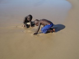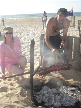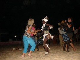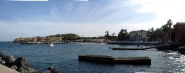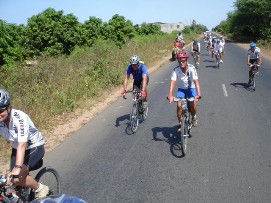 Perhaps some of you remember that during the Tour d'Afrique some of us participated in the so called naked mile. Often this event was mentioned and the intention of some of boys to do something similar was in the air and finally, here they were, Arnoud and Kevin drove by the lunch stop without anything else than their Adam's costume! The 100km “miles stone” was reached shortly after lunch. It would have easily be possible to get to Dakar in one day, but why not take another stopover in M'Boro sur Mer the organization decided. Rudy promised us a very nice last meal he was going to prepare for us there, so the motivation was there. The barbecue that Rudy and Marianne promised us was wonderful, sitting on a porch with a view over the beach and the sea, seeing the sun going down, we had a wonderful meal and Jenny was ever able to score 2 bottles of wine. Let me say here and now that our cooks have done a wonderful job during this trip, they knew how to make sure that the stomach of the cyclists were always full and paid special attention to hygiene, to make sure that the food was not going to upset our stomaches. A wonderful couple! M'Boro sur Mer is a small fisher town, much friendlier than the town where only men lived back in Mauritania. Kids were playing at the beach, some trying to catch a fish with their bare hands. The sea here is so full of fish, that that is possible. Back to the top |