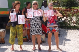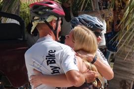 Just before the sun appeared, I went to take a swim in sea and as there was nobody on the beach, decided not to use my swimming trouser and leave tht with my slippers and towel on the beach. When I got out of the sea, I saw one of the dogs that were lying on the beach running away with my trouser! So I ended up running naked of the beach to get my belonging back! So no naked mile fo me, but at least a naked run of a couple of hundred meters. I got it back, the dog finally decided to let go. The last part of our tour was easy as easy could be. Only about 80km, so our departure was scheduled for 9:00am with a long lunch and a nap before we went for the last 20km to the finish in Dakar at Lac Rose. The place where the car rally also stops. The convoy was nice, a maximum speed of 15km/h, a lot of chatting, shaking hands and making compliments to each other. It is nice to hear that young people feel we have inspired them as “oldies” to be able to do the 7200km. Arriving all together at the hotel at Lac Rose was a big surprise. Djembe music, and Priscilla en Lucien standing their with a banner saying “Jenny and Kees have finished the Race” . Priscilla surprised us with two bottles of champagne, that we opened a gladly shared between all of us! For Hannie and Marius there was a big surprise as their daughter had unexpectedly decided to welcome them in Dakar! |